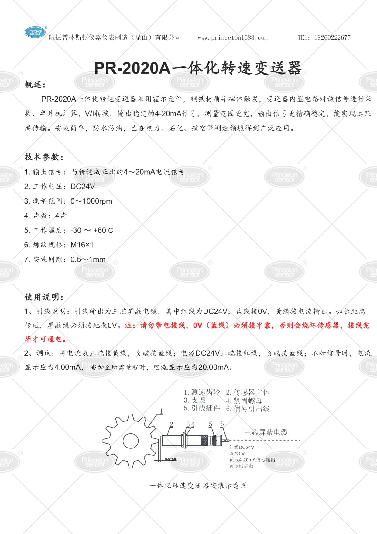 1. 输出信号:与转速成正比的4~20mA电流信号